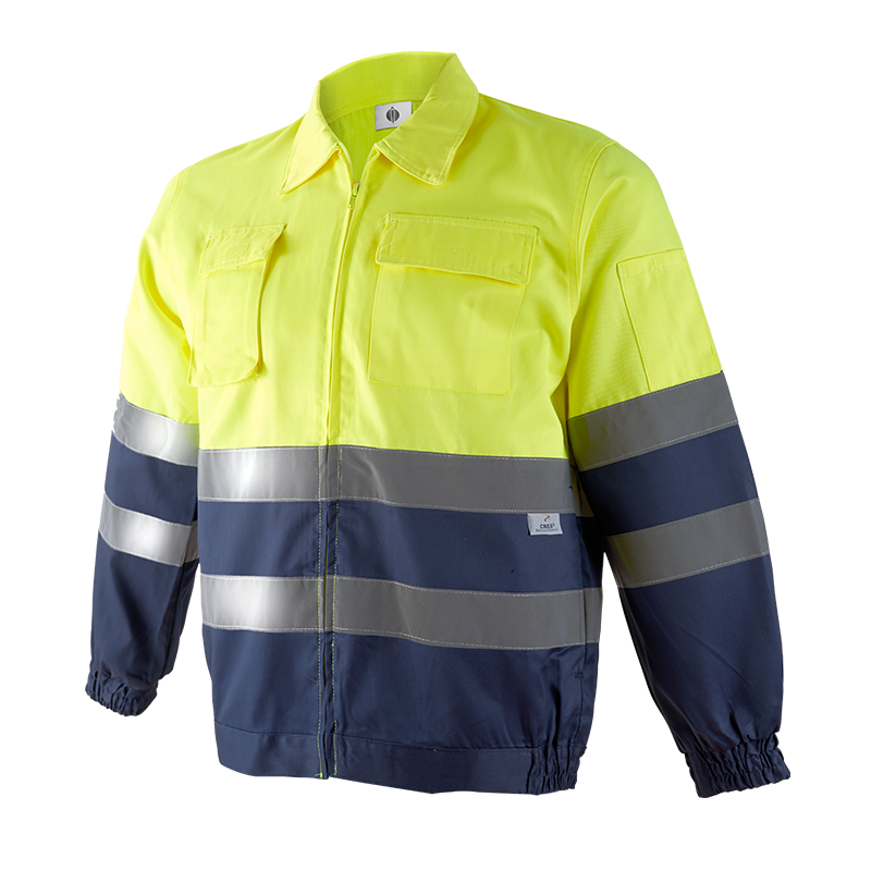 Sarga flúor de 260 g/m2 (40% poliéster y 60% algodón). Contraste de 200 g/m2 (65% poliéster y 35% algodón).