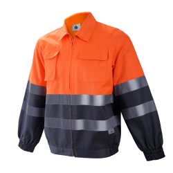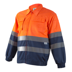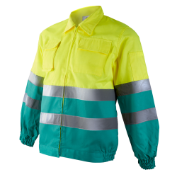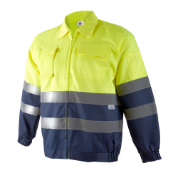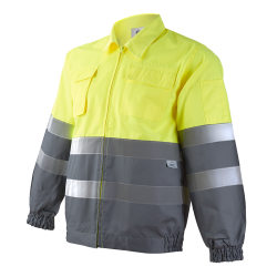 Sarga flúor de 260 g/m2 (40% poliéster y 60% algodón). Contraste de 200 g/m2 (65% poliéster y 35% algodón).