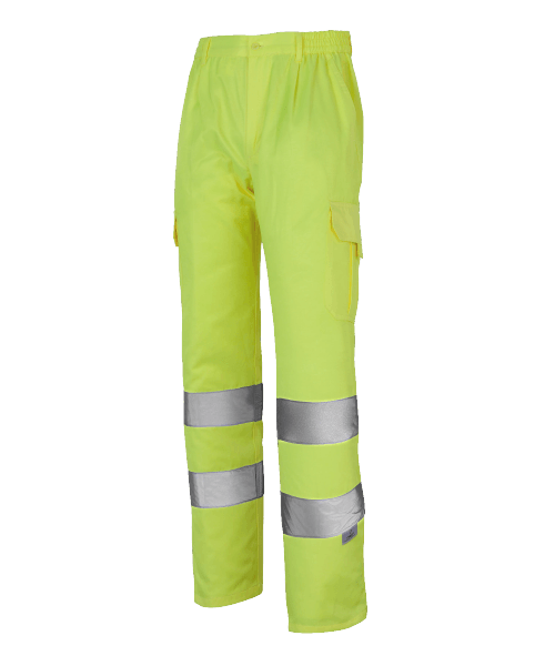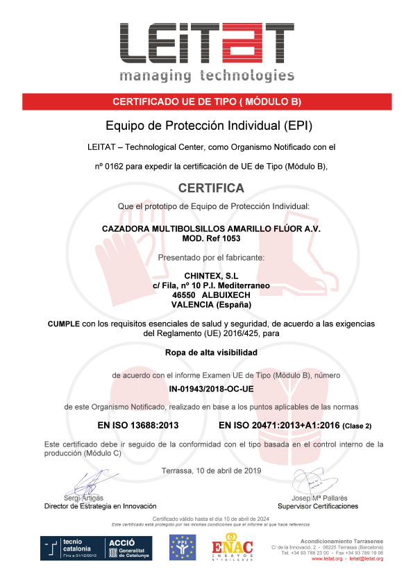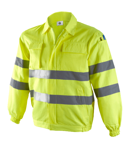 En este caso de ejemplo, tanto la cazadora como el pantalón cumplen clase 2 de la norma EN ISO 20471 de manera individual. Cada prenda tiene su propia certificación, pero además se han certificado las dos prendas como conjunto, consiguiendo una clasificación superior gracias al aumento de banda reflectante y de tejido flúor.